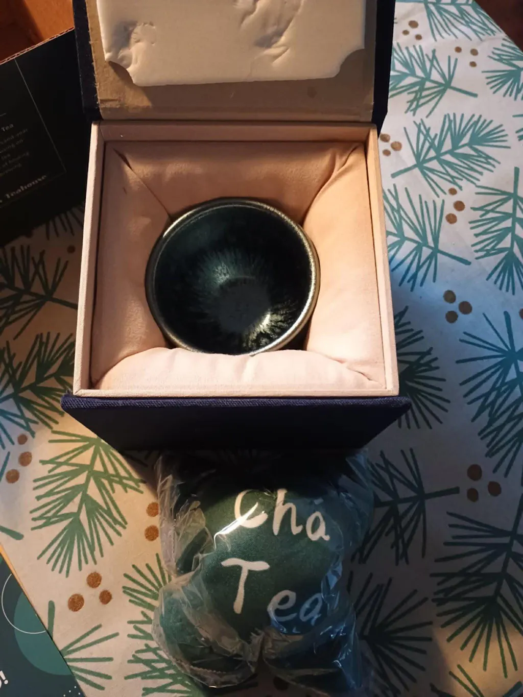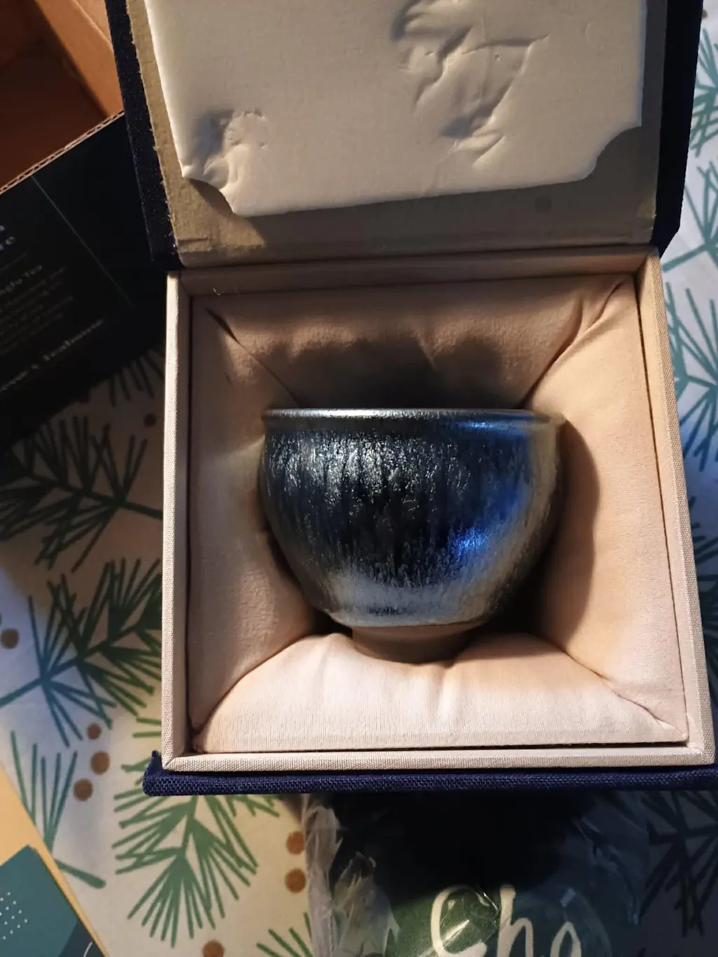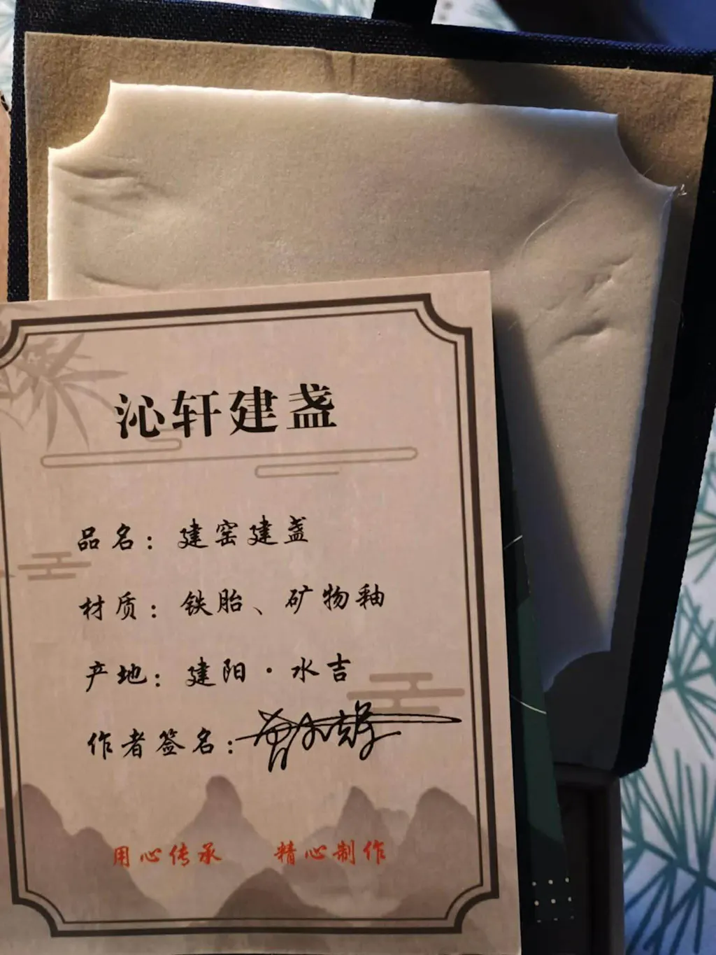 Each Jianzhan cup comes in a gorgeous blue box with calligraphy reading "Jesse's Teahouse" attached on the outside, along with our red company seal carved by Master calligrapher Tang Qingnian.